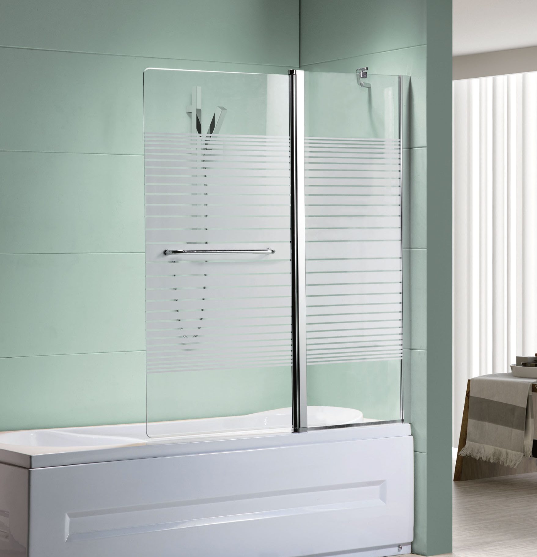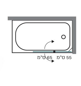 אמבטיון מבנה: דלת על ציר רוחב 65 ס"מ נפתחת פנימה והחוצה ודופן קבועה רוחב 55 ס"מ. גובה 140 ס”מ. פרזול: צירי HI-PRO עולים בפתיחה ויורדים בזמן סגירה לאטימות מירבית. מוט תמיכה מעוצב, ידית מתלה מגבת, מגבי אטימה. פרופיל כרום מעוגל. זכוכית: 6 מ”מ מחוסמת, גרניט או צריבת פסים.