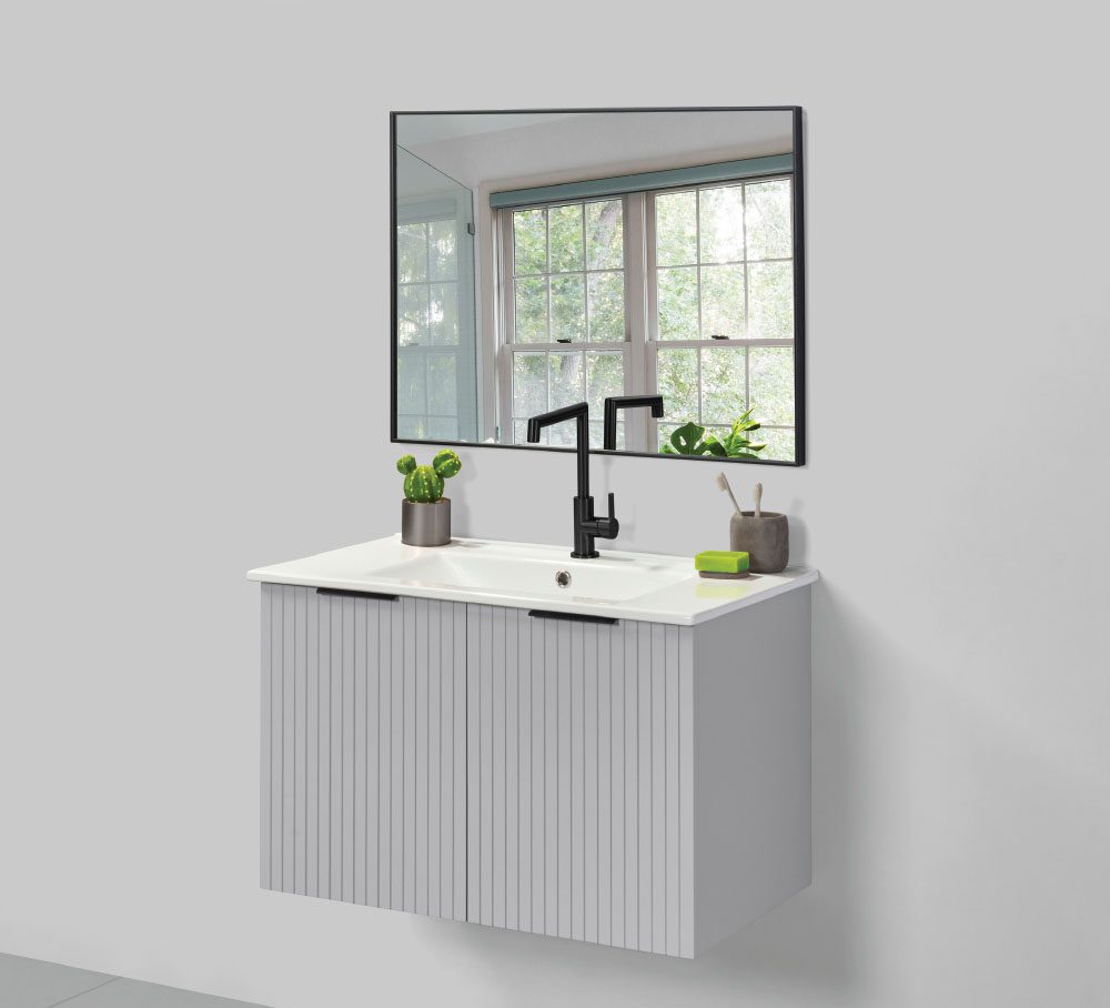 ארון תלוי בסגנון מודרני עם 2 דלתות בחזית מחורצת וידיות אינטגרליות מראה אלגנטי עם טוויסט טקסטורלי שמוסיף עומק ואופי לחלל הרחצה מגיע עם כיור אינטגרלי עם אפשרות שדרוג כיור/משטח