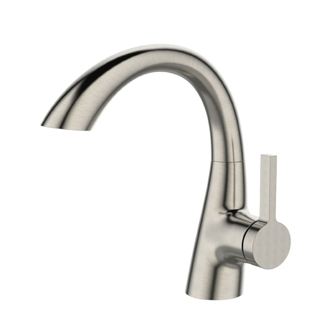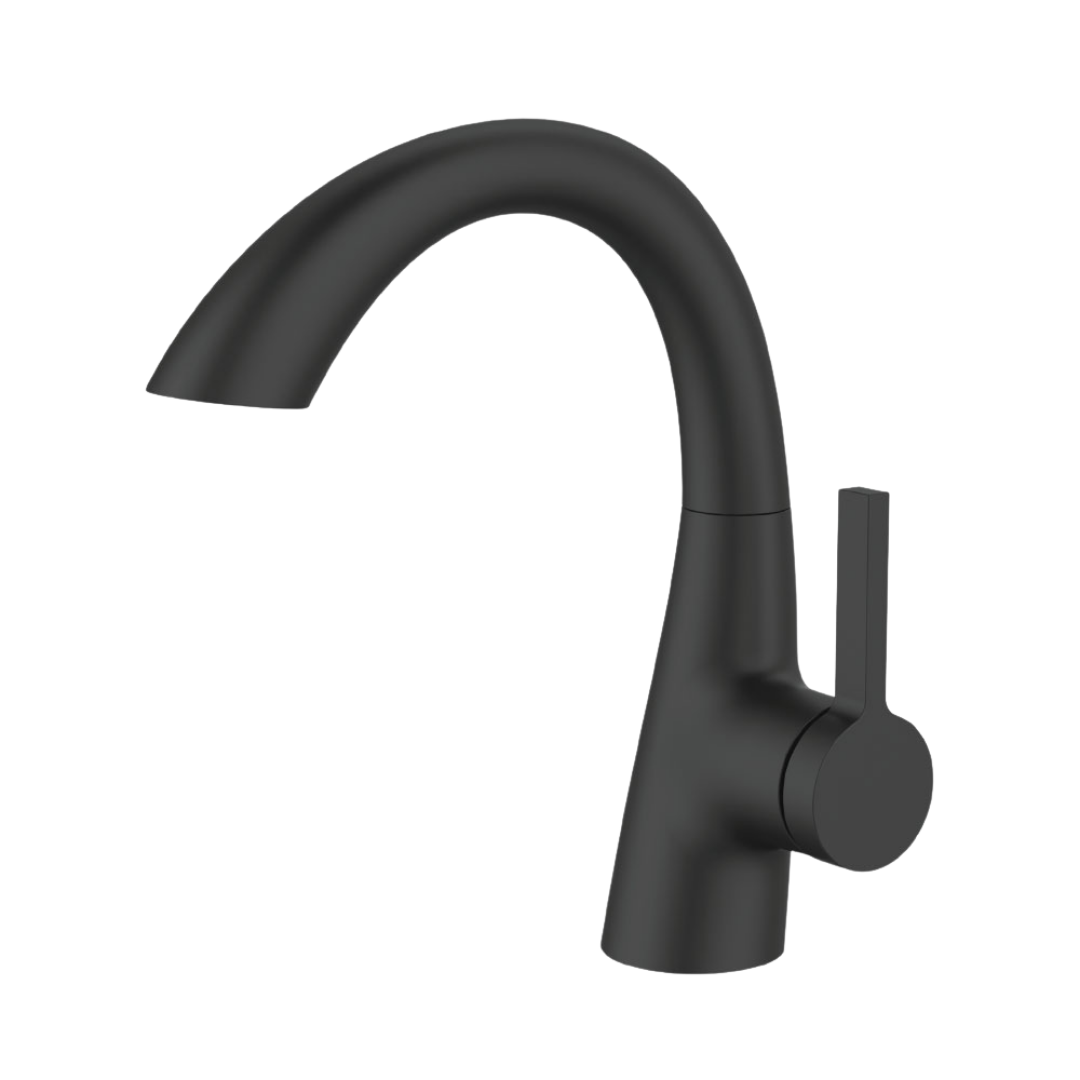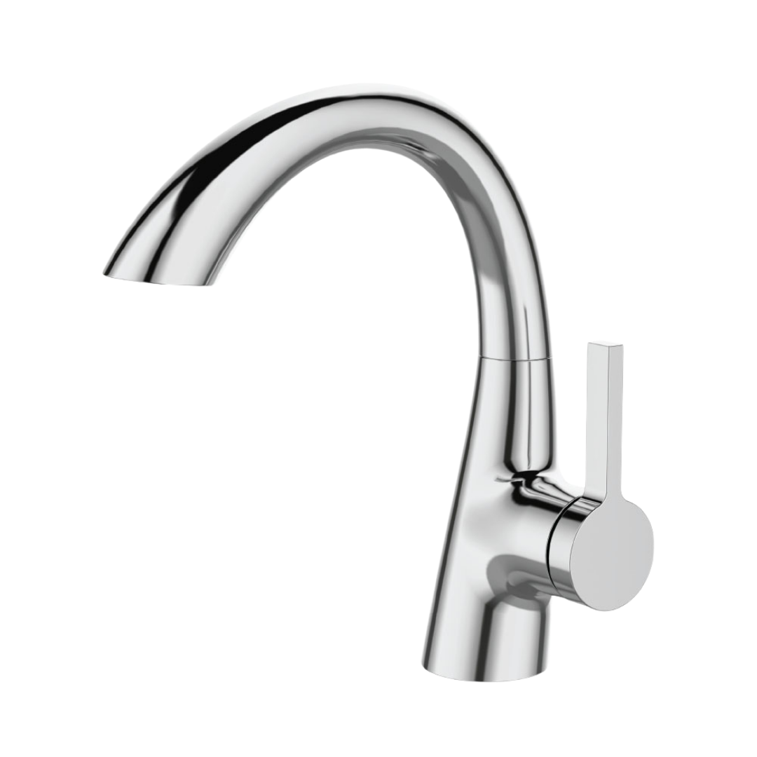 ברז בעל קווים רכים ופיה קמורה המשתפלת בעדינות יוצר תחושת זרימה טבעית ומשלים עיצוב הרמוני ואחיד לחלל הרחצה