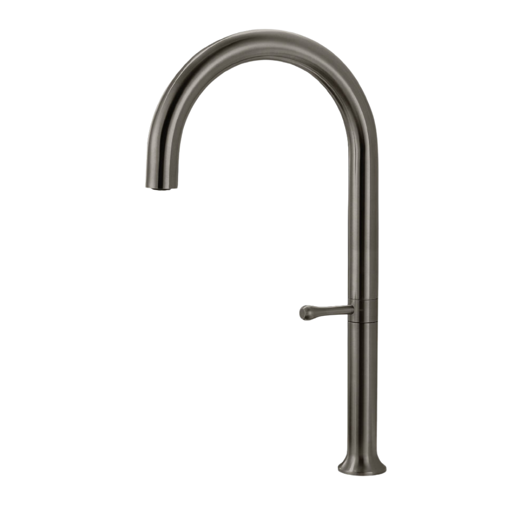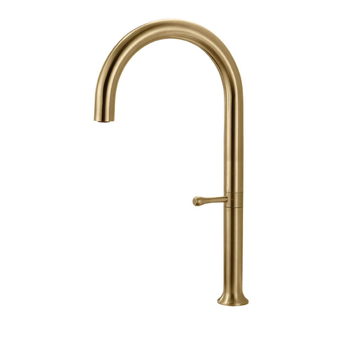 ברז גבוה בעיצוב מעוגל ואלגנטי עם ידית צד מינימליסטית מוסיף זרימה רכה ואופי יוקרתי למשטח המטבח